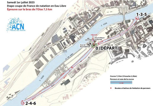 Les distances 3km et 7,5km sont des étapes de la coupe de France. Mais elles sont également accessibles à tous. Deux autres distances (500m et 1000m) sont proposées pour le plaisir de nager en eau libre. Parcours en rivière dans un bras de l'Oise d'une longueur de 1,2 km. Le départ se fait depuis la base nautique de l'Ile Saint Maurice. La température de l'eau est actuellement de 23 degrés. Pour plus de renseignements ou pour une inscription tardive, appelez le 06 95 74 12 30