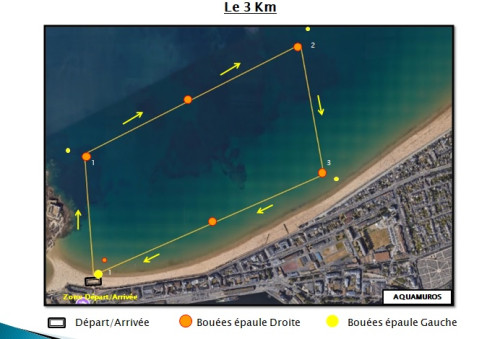Départ plage de l'Eventail, un passage de bouées derrières le Fort National en direction de l'ouest, pour rejoindre ensuite la plage de Bon secours en contre-bas des remparts (passage entre le grand bé et la côte). Contournement de l'île du Grand Bé et passage entre le Grand Bé et le Petit Bé pour un retour vers la plage de l'éventail en contournant plus au large le fort National. 1 boucle.